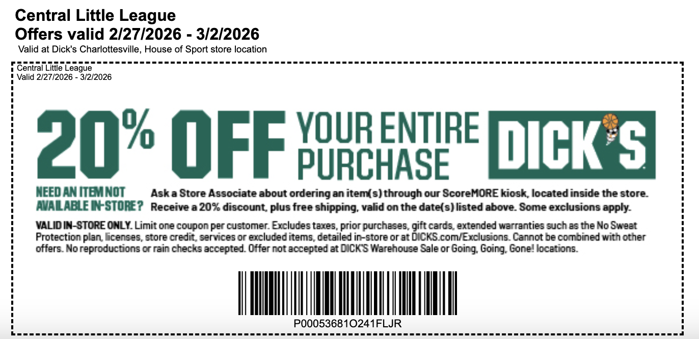 Dick's Sporting Goods is partnering with Central Little League to raise funds for the league. Use the coupons below to get a discount when shopping in-store at Dick's Sporting Goods at 5th Street Station (120 Wegmans Wy Suite 200, Charlottesville, VA 22902). Central Little League will get a portion of the proceeds from the sales made using our coupons.